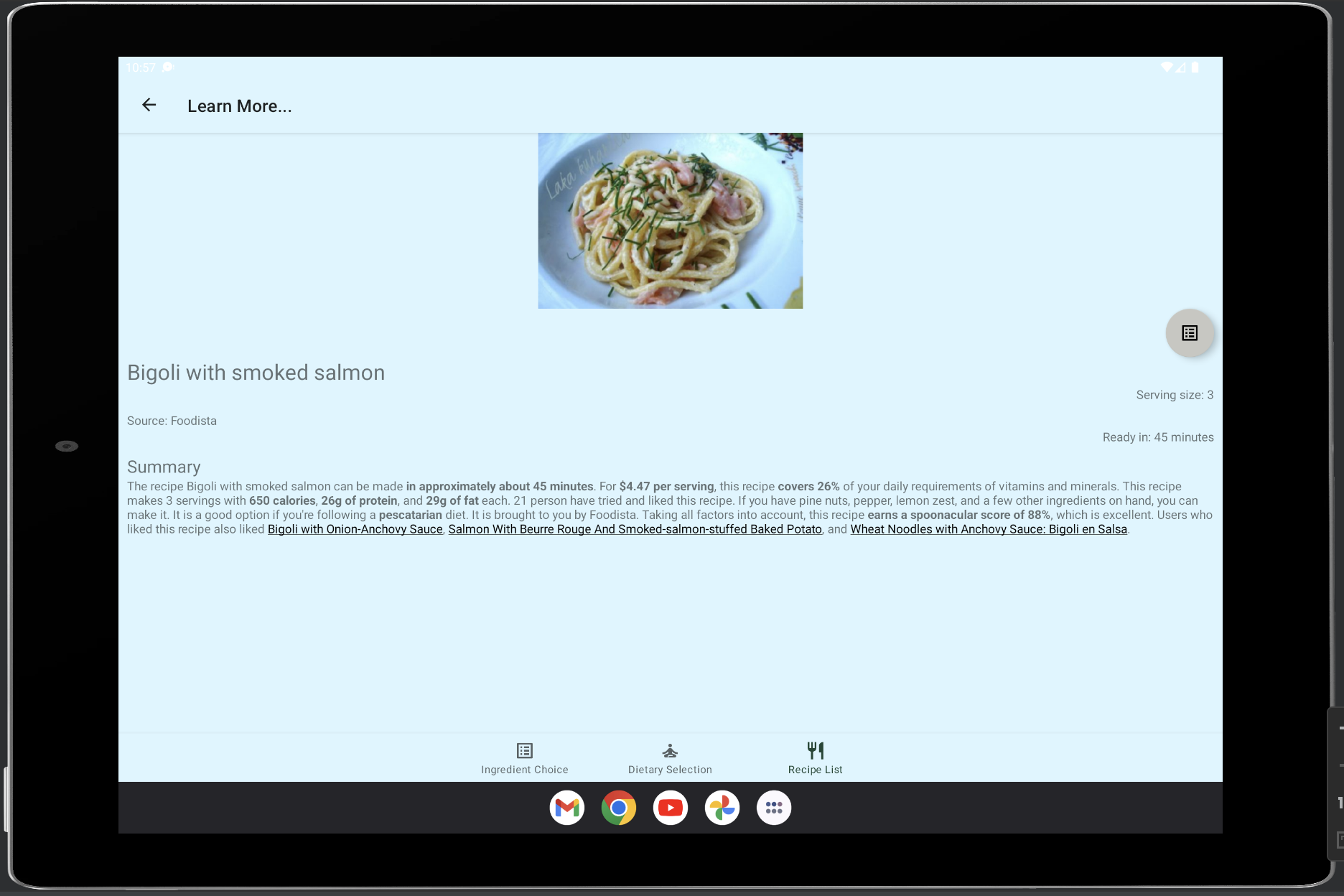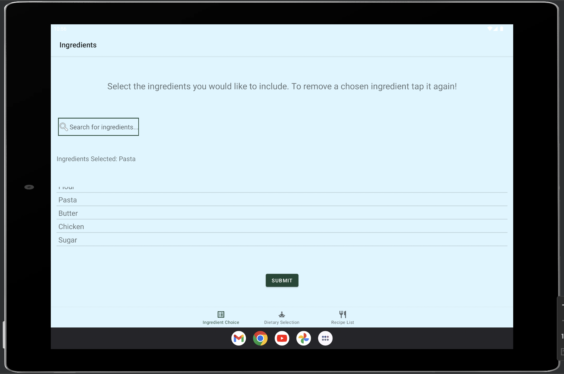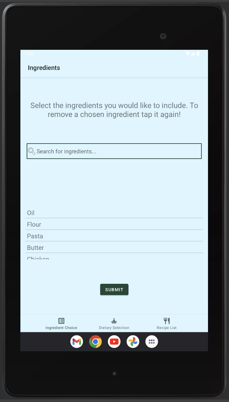 In a time crunch? SizzleAndMunch will give you recipes that will give you easy ideas for lunch! SizzleAndMunch is an application that will generate recipes based on the ingredients and dietary restrictions selected by the user.
